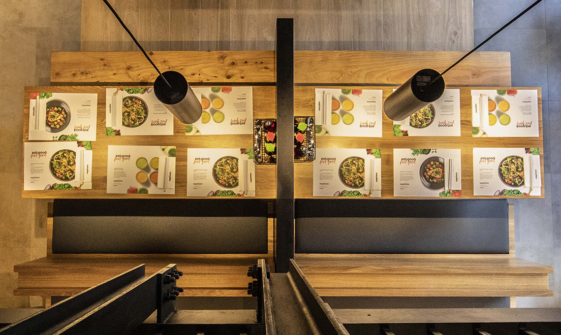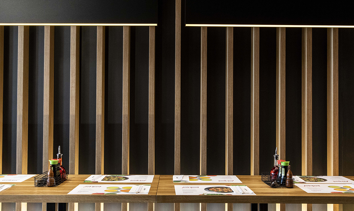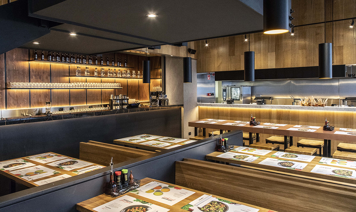 Improntato sulla convivialità, Wagamama accoglie gli ospiti su ampie tavolate, così come in angoli più riservati: tutto rigorosamente in legno chiaro (anche le panche) che contrasta e viene esaltato dalle pareti color ardesia e ghisa.