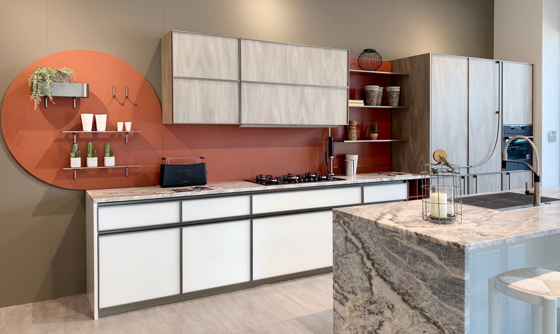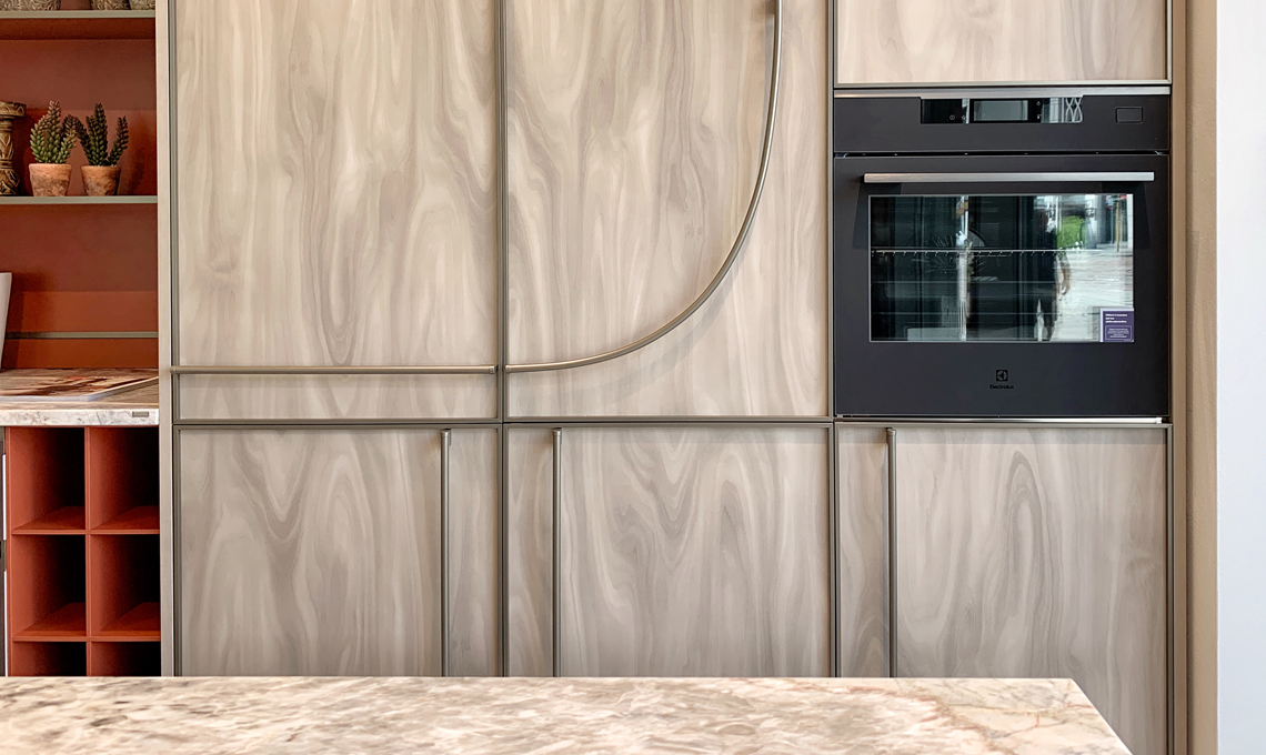 Gole continue finitura titanio e maniglie, anch’esse in metallo, convivono e dialogano con le profilature delle ante, disegnando scenari sempre diversi.