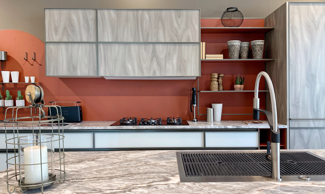 Nella composizione proposta, il marmo fior di pesco carnico del top si contrappone al rosso mattone opaco della lunga schiena laminata.