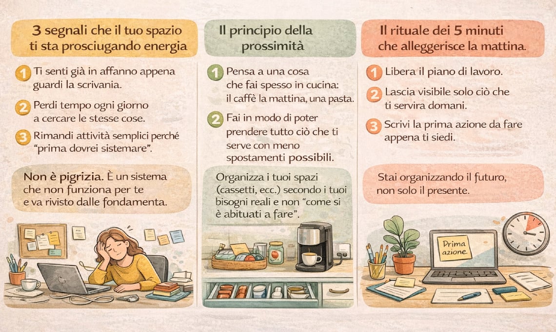 "Lo spazio è uno specchio. Quando rientri dopo una giornata complessa e trovi il tuo angolo preferito pronto ad accoglierti, stai vivendo un’esperienza regolatrice: abbassi il livello di stress. Quando trovi subito ciò che ti serve, riduci il numero di micro-decisioni che affollano la giornata. È così che l’organizzazione diventa prevenzione del sovraccarico mentale."