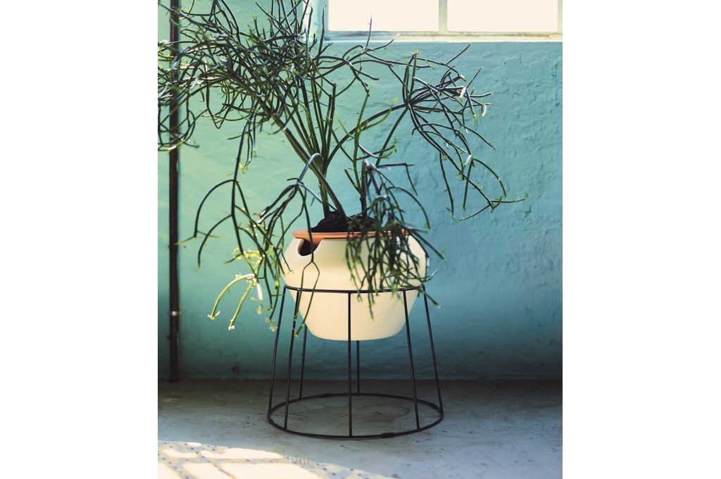 Vaso a riserva d'acqua con sostegno, design Iina Vuorivirta, in terraglia e acciaio [Ikea PS 2017, portavaso diam. cm 24x21h; vaso interno diam. cm 21x21h; supporto diam. cm 29x30h € 24,90].