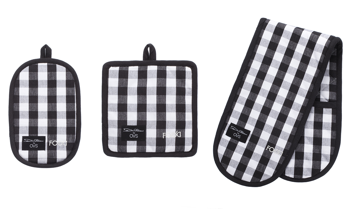OVS presenta una collezione dedicata alla tavola realizzata in collaborazione con lo chef stellato Davide Oldani. Presine, guanti da forno, canovacci, grembiuli, runner e tovagliette, in tre colori, rosso, nero e fantasia vichy bianco e nero in omaggio ai colori del ristorante dello chef D'O.