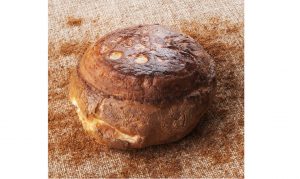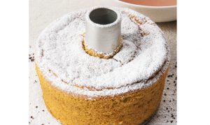 Montare gli albumi con 70g di zucchero (meringa francese). A parte montare a bagnomaria i tuorli con lo zucchero rimanente, il sale e il centrifugato di zucca fino a ottenere un composto spumoso e compatto. Amalgamare i tuorli alla meringa, quindi unire la farina, l’amido di mais e il lievito setacciati e infine l’olio di semi. Dividere il composto in stampi a ciambella e cuocere in forno a 160 °C per circa 14 minuti. Lasciar raffreddare.