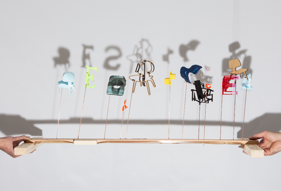 La prima e l’ultima vetrina sono dedicate alla spiegazione del progetto, mentre le sei centrali accolgono tessuti dalla trama complessa su cui vengono proiettate ombre, generate dal movimento continuo di piccole lettere e modelli in scala di oggetti di design.