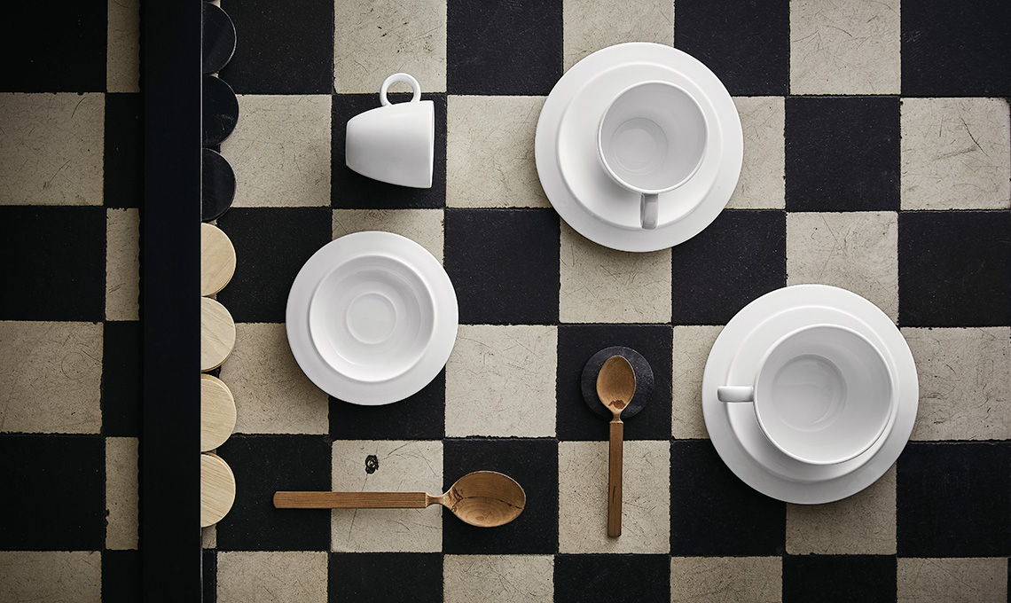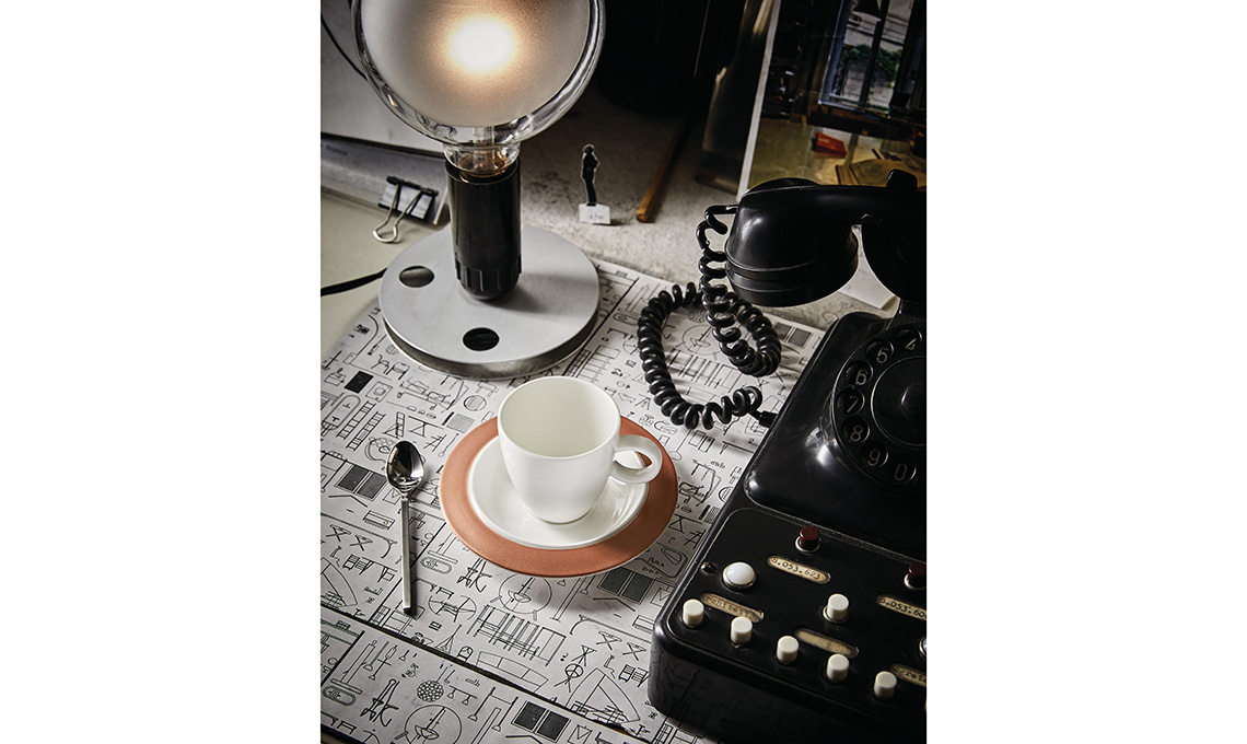 'Bavero' design Achille Castiglioni per Alessi, 1997. Edizione speciale 2018. Set di due tazze da caffè con sottotazza in porcellana decorata, rame. Foto Matteo Imbriani.