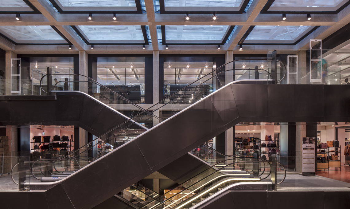 Disegnata da Vincent Van Duysen, la facciata ha un’estetica essenziale che esalta le 96 finestre e le 7 vetrine incorniciate da finiture in bronzo scuro. La ripetizione di elementi architettonici creano un senso