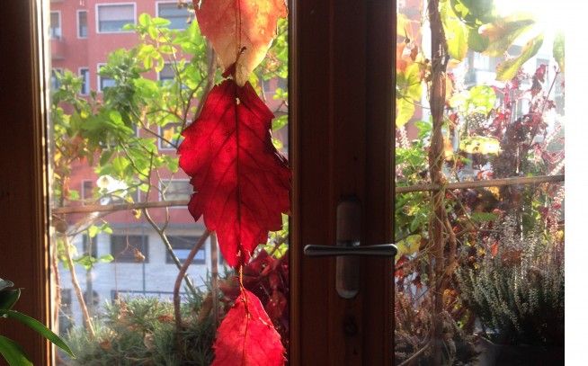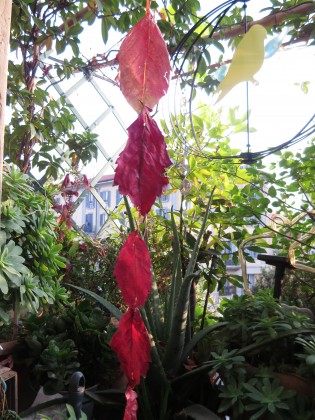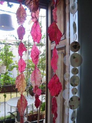 Così, con un’idea che mi frullava in testa da tempo, ho agito. Avanzi di candele sciolti in un pentolino, le foglie raccolte per terra (e poi tuffate nella cera), un ago per bucarle e del filo di nylon per fissarle l’una all’altra. Il risultato lo vedete qui: una tenda tutta-natura per un autunno che non finisce qui.