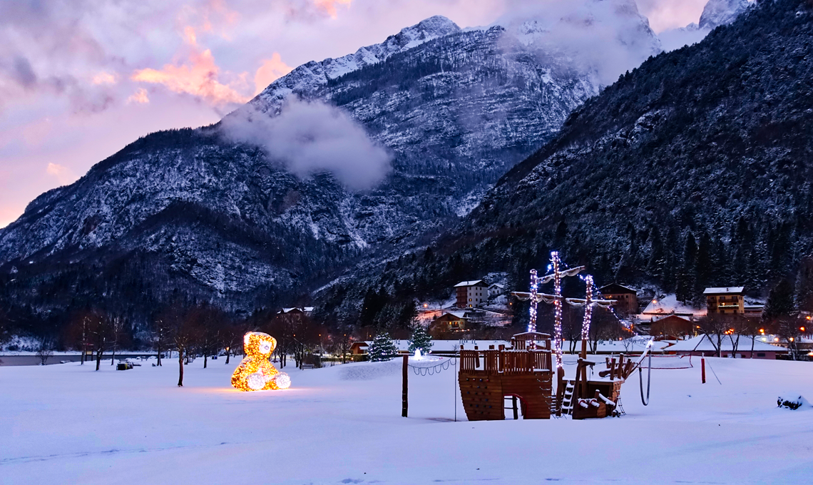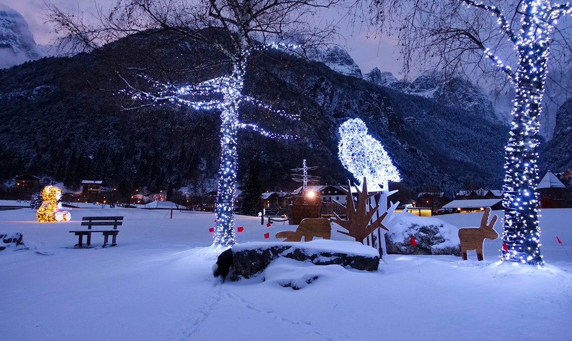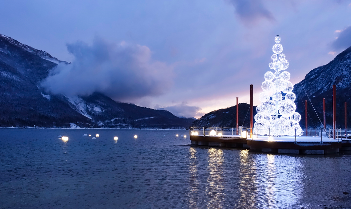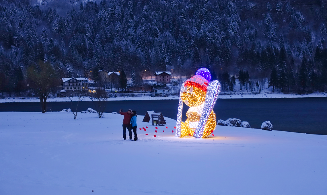 Al calar del sole, entrando nell’ampio spazio verde che circonda le rive del lago e passeggiando verso le sue dolci acque, si scorgono grandi e scenografiche installazioni luminose, ispirate agli animali del bosco. Proseguendo, si incontra l’opera della giovane artista trentina Ortensia Benussi, e più in là, su di una piattaforma galleggiante, si erge un albero di Natale alto 10 metri, composto da sfere luminose che, specchiandosi nell’acqua, contribuiscono alla creazione di uno straordinario panorama da fiaba. Il paesaggio innevato è solo l’ultima 'chicca' che arricchisce ulteriormente l’esperienza.
