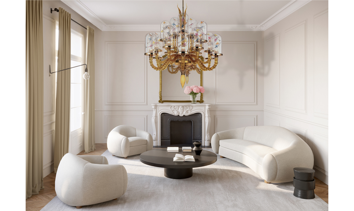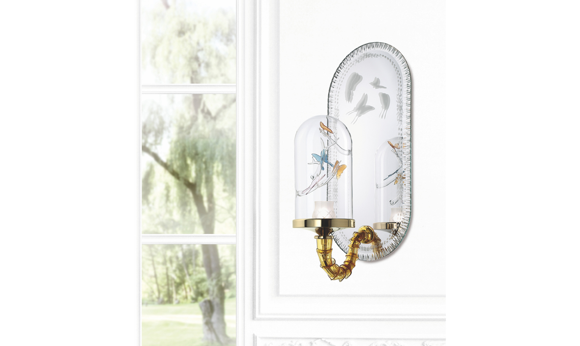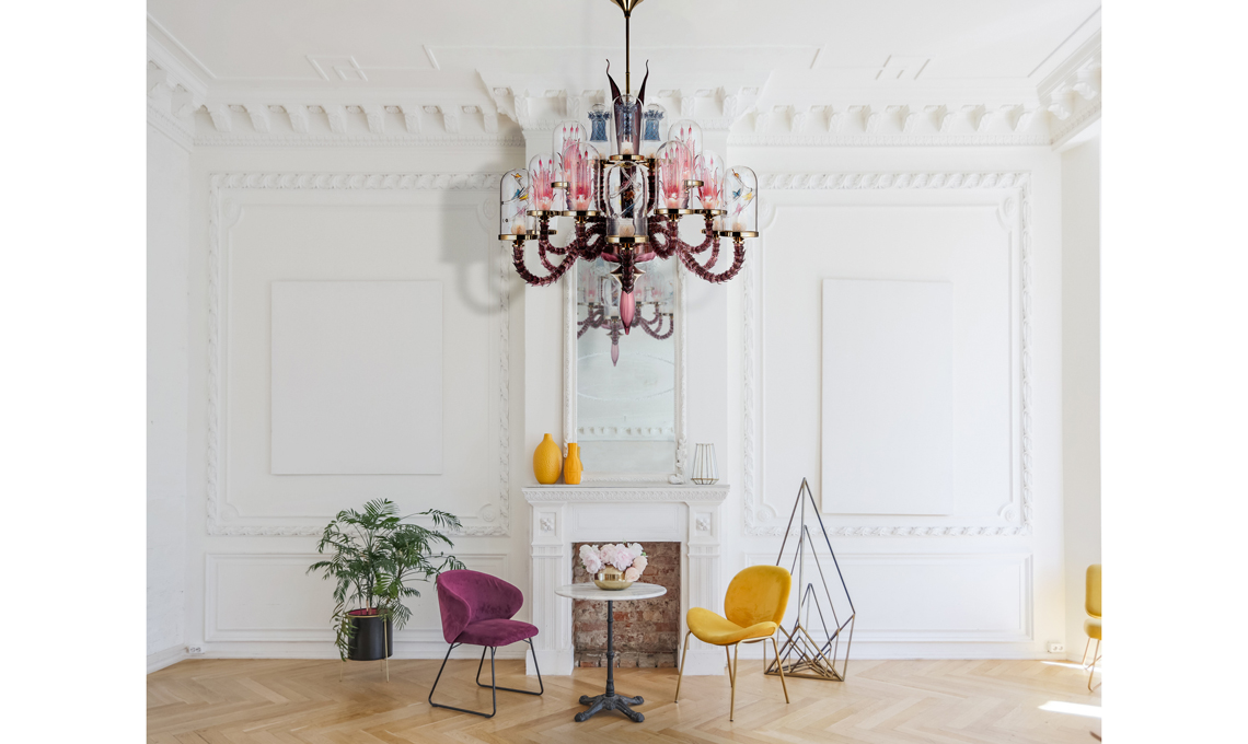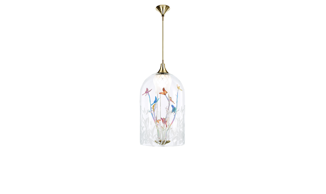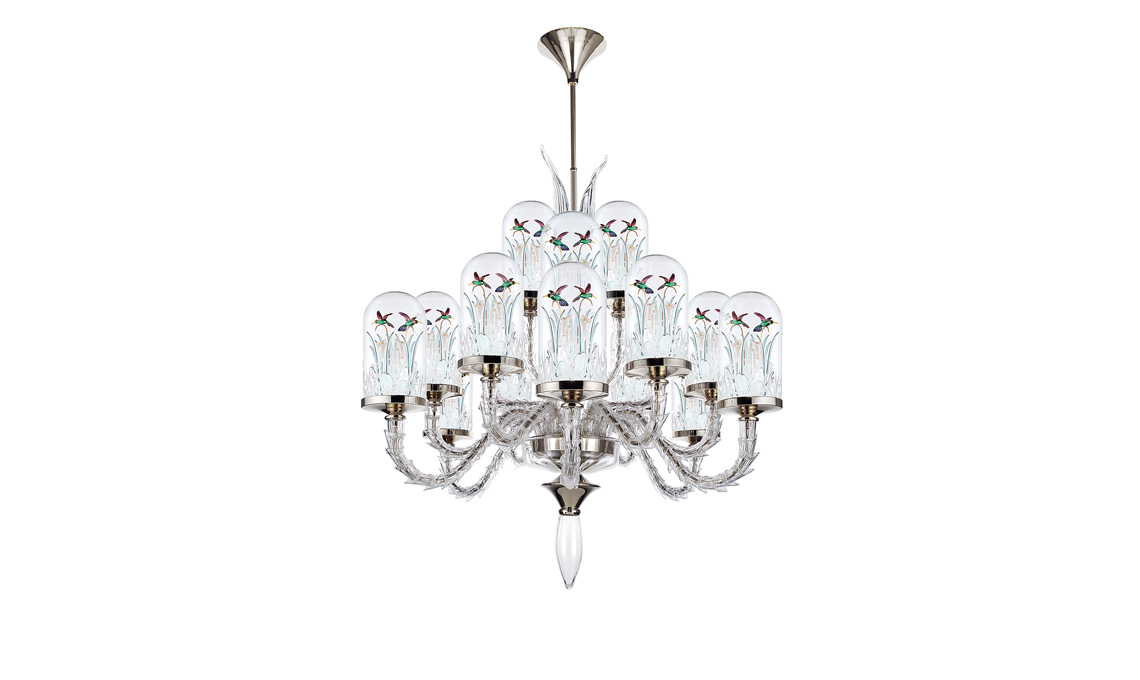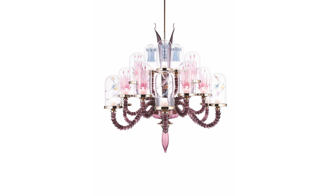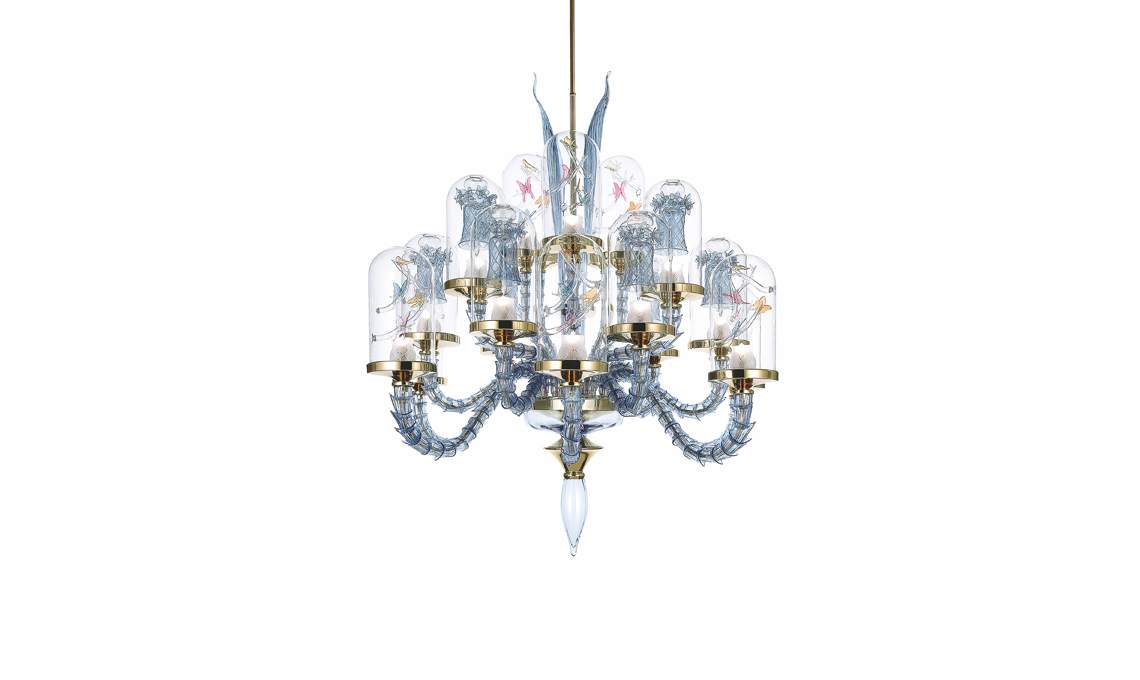 Lo scenografico chandelier di Jardin de Verre racchiudono in campane trasparenti soggetti diversi realizzati in vetro: un omaggio all’abilità manuale dei Maestri muranesi in grado di realizzare in dettagli minuziosi preziose tife con foglie ricurve, farfalle posate su rami sottilissimi, campane con la coppa intagliata e un battacchio prezioso, colibrì in volo.