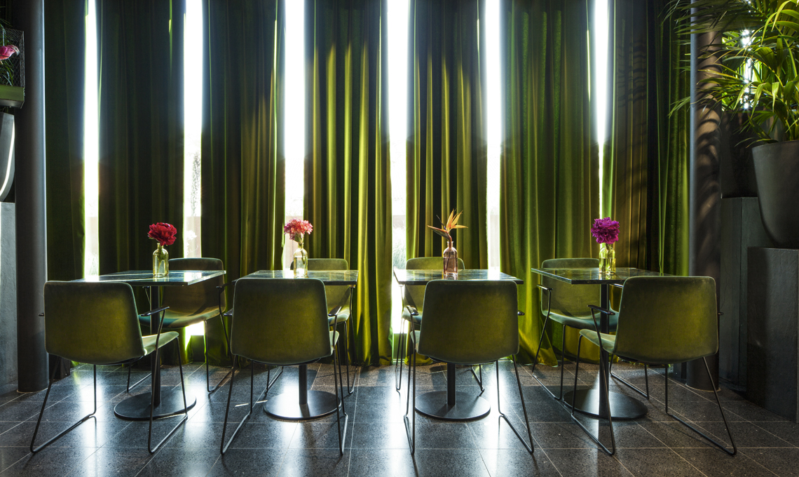 All’ingresso e nella caffetteria troviamo le sedie Tweet e le poltroncine imbottite Log, tutte realizzate in velluto e dai colori personalizzati.