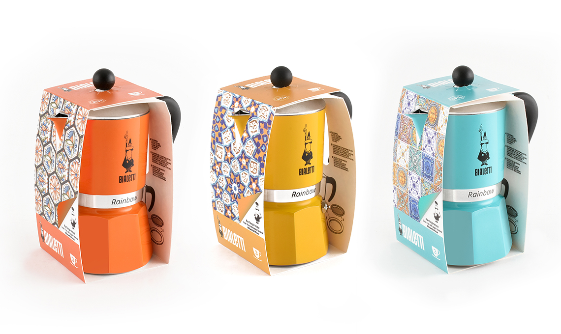 Rainbow Limited Edition Maioliche rivisita la classica moka con il corpo in alluminio lucido e colorato in tonalità brillanti come il giallo, l'arancione e l'azzurro. Il manico ergonomico è realizzato in materiale plastico antiscottatura.
