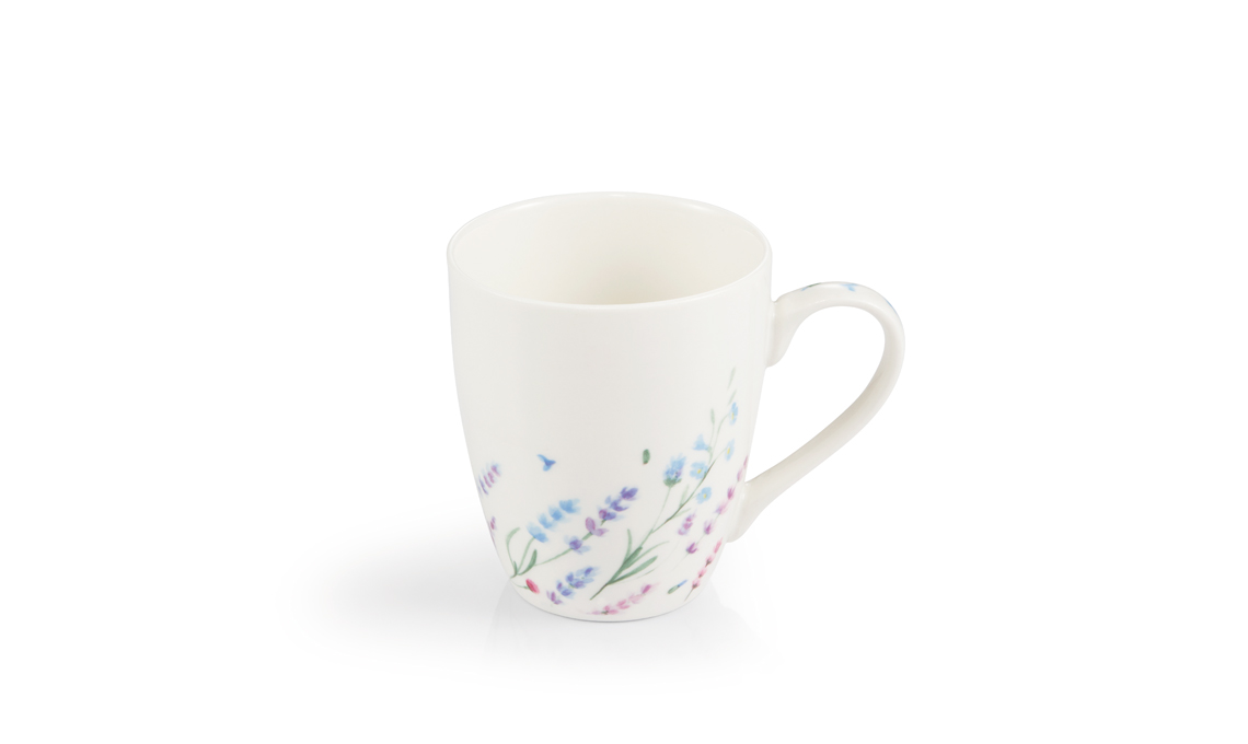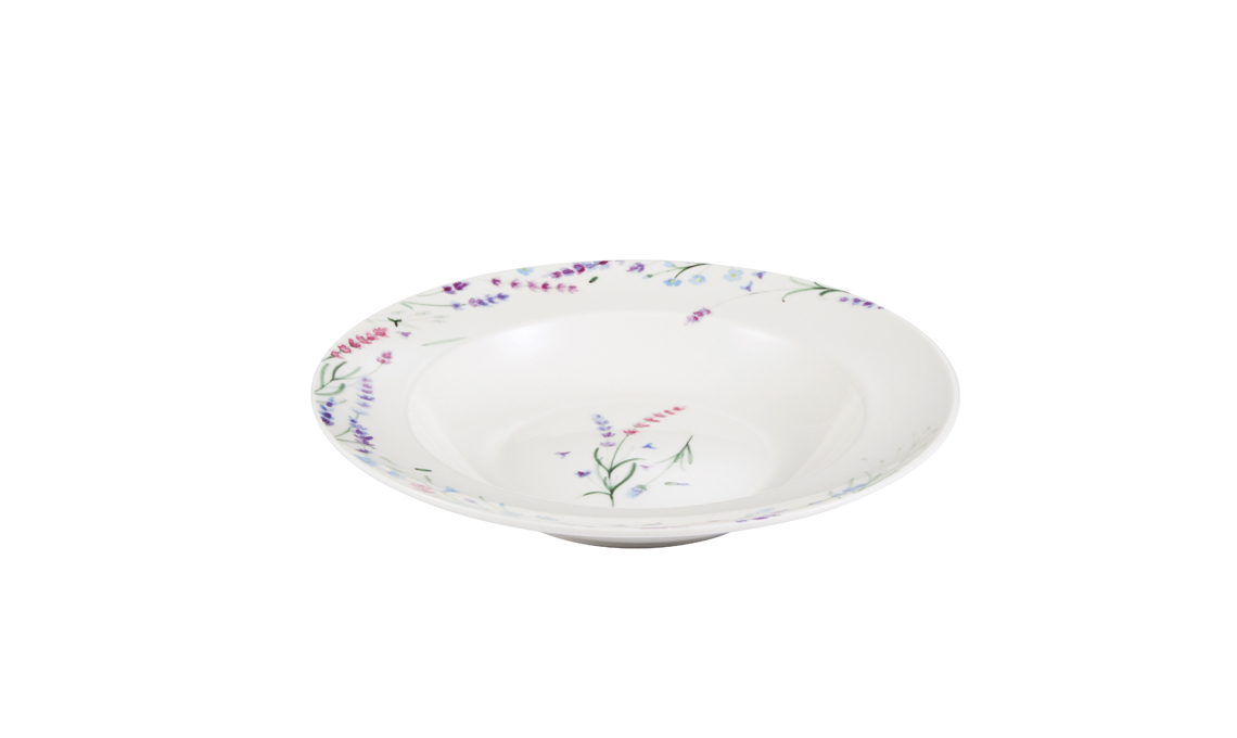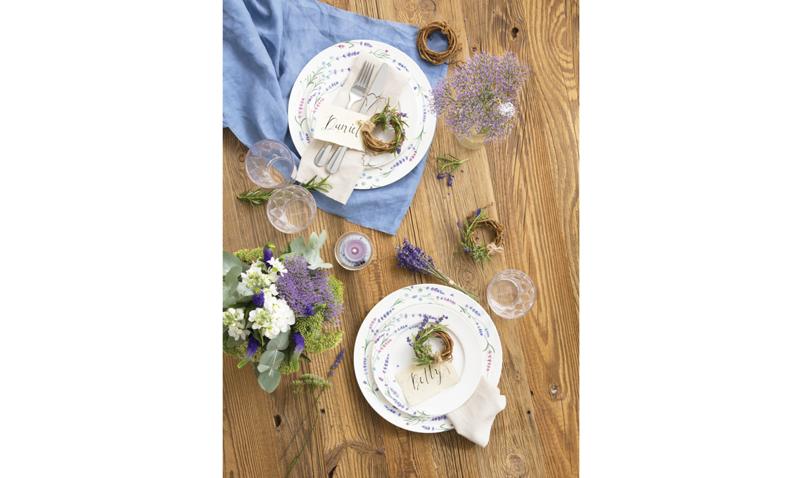 Per una mise en place dal gusto rétro, la linea di stoviglie Provence in porcellana, prende ispirazione dalle distese di lavanda in fiore.