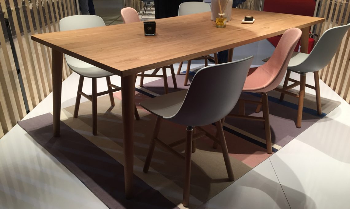 Come Sette su Sette, sedia in legno e materiale plastico, impilabile e il tavolo 2 più 2 con struttura in tubolare ruotato di 45 gradi di Brogliato e Traverso.