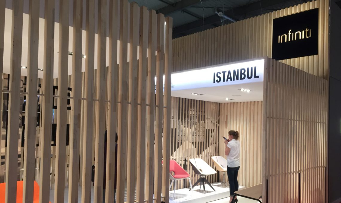 Gabbie di legno e isole di attenzione per lo stand di Infinìti al Salone del Mobile 2016: l'azienda lavora da tempo sui materiali, sugli stampaggi plastici associati al legno.