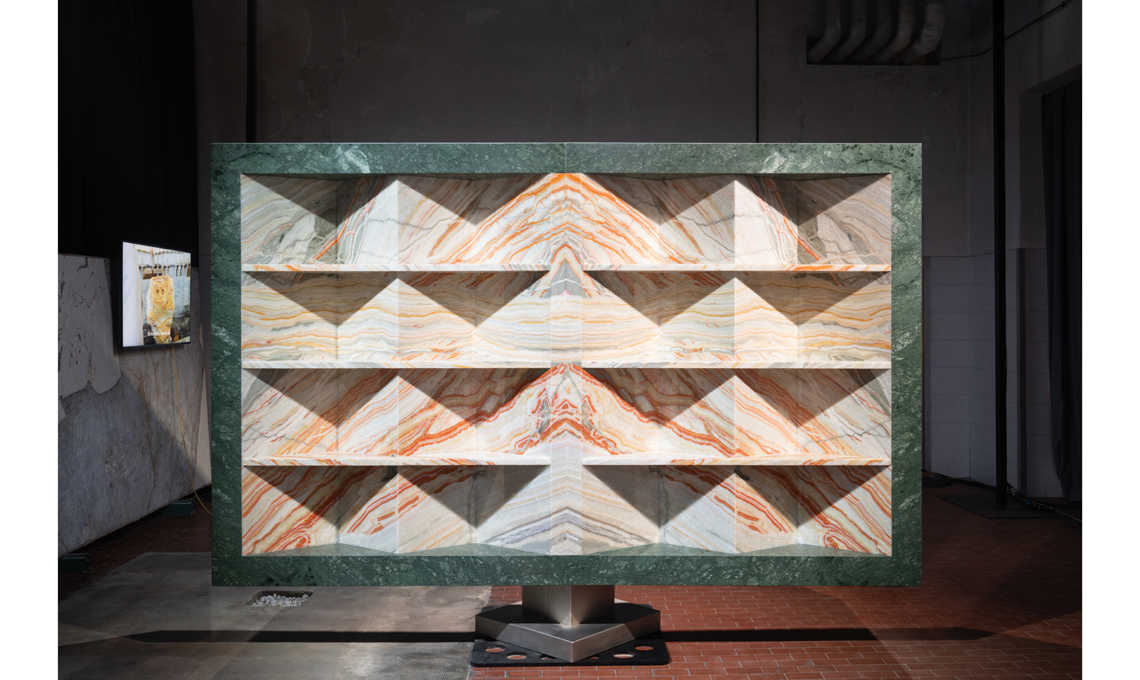 Nella sala successiva è esposto Balance di OMA, un armadio multi-funzionale creato in Marmo Satin Verde con scaffali in Onice Fresh Flow. L’armadio, che può essere utilizzato sia come scaffalatura aperta, che come mobile chiuso, sfida esteticamente la percezione della gravità, appoggiando su un supporto singolo che può essere facilmente ruotato.