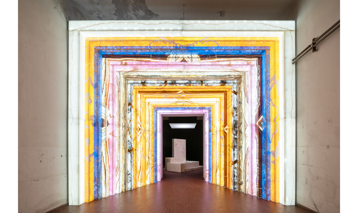 All’ingresso, i visitatori sono invitati a scoprire una gamma di progetti ed oggetti unici, a partire dalla sorprendente installazione a parete, creata con nove diversi tipi di onice. Le lastre, assemblate in sequenza, formano uno scenografico portale tridimensionale.