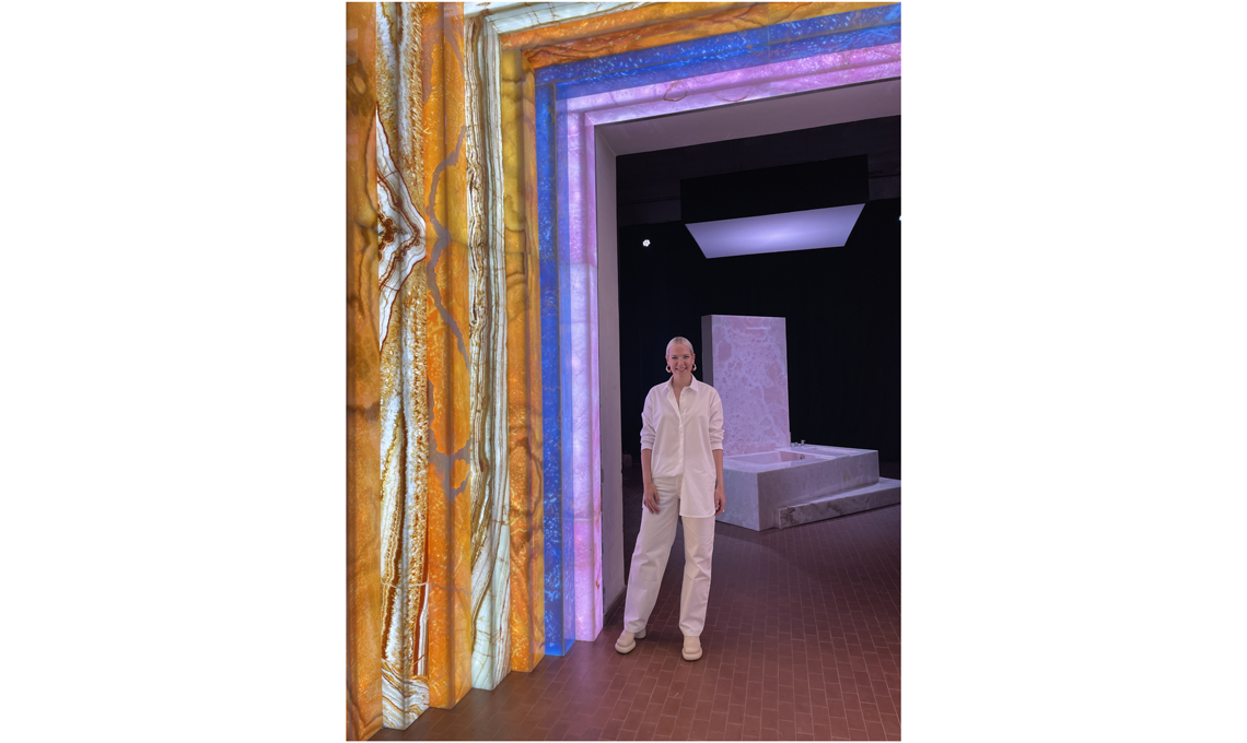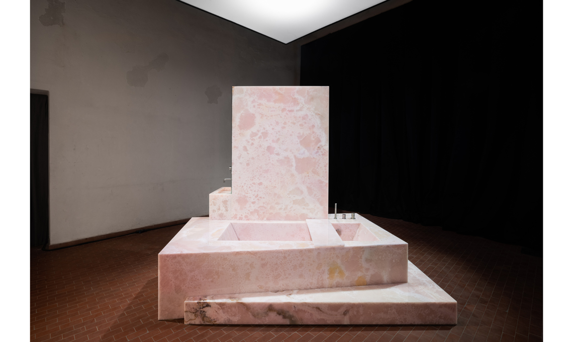 Entrando nella prima stanza, l'occhio è catturato dall’opera di Sabine Marcelis, un monolite in Onice Rosa Chiaro dà vita all’installazione artistica di un bagno, che può essere ammirato a 360 gradi, come una scultura a tutto sesto. In questa fantasiosa installazione ciascun elemento sembra risplendere in un’opera in cui forma e funzione coesistono organicamente.