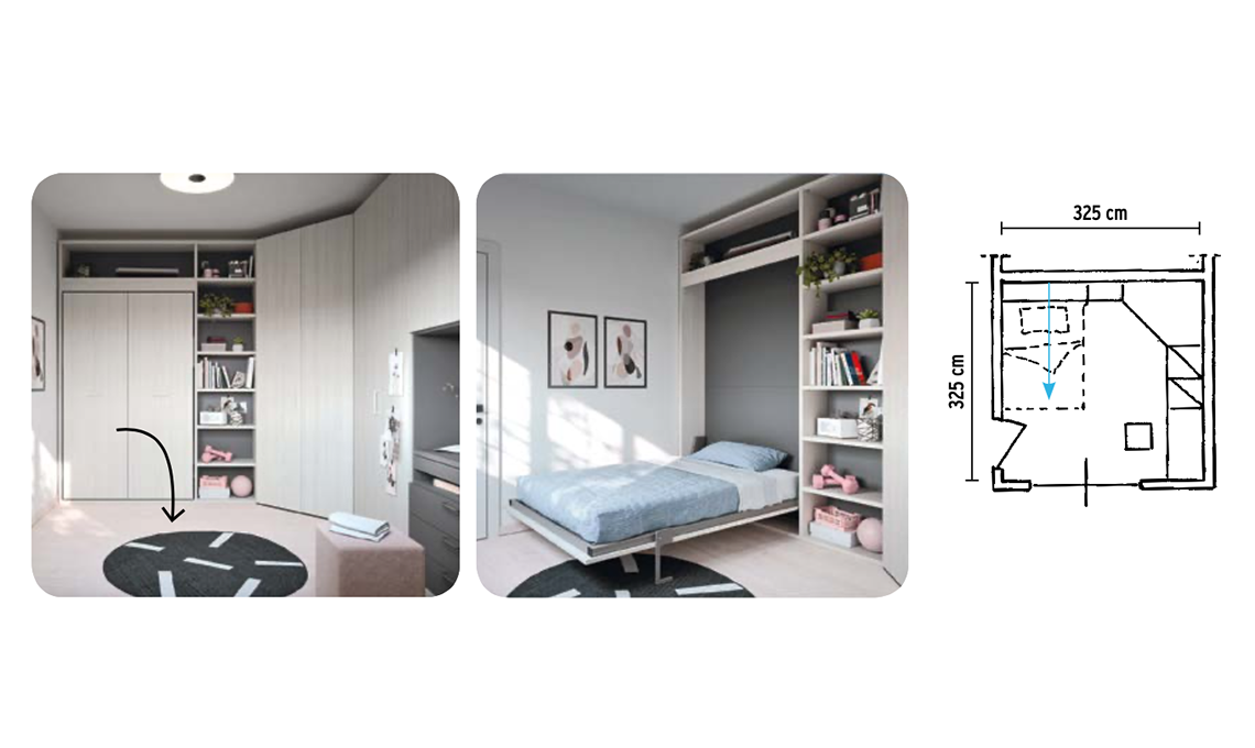 Se le dimensioni della stanza sono al limite (8/9 mq) ma non si vuole rinunciare alla comodità né a uno spazio gioco, si può ricorrere a un letto a ribalta che, quando non serve, si richiude in verticale dentro il modulo di un armadio. In foto, letto a ribalta Twiddy da cm 136x208 [Nidi].