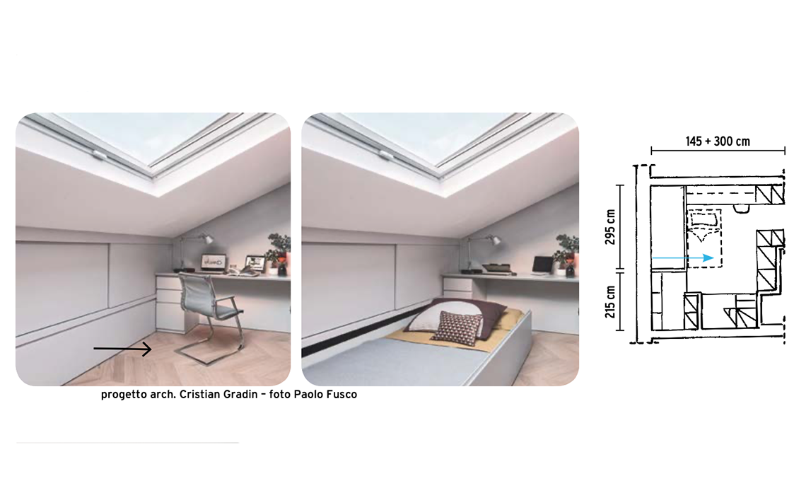 In mansarda si sfrutta la parte in cui la falda del tetto è più bassa con un cassettone da cm 100x200 con rete a doghe e materasso. Quando c’è un ospite si estrae il cassettone e il letto è pronto. Questa soluzione si può adottare anche
