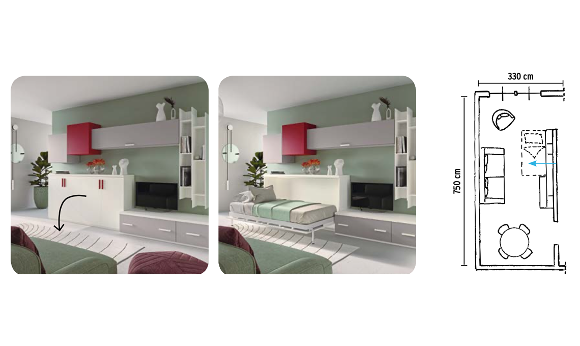 i libri e la tv. Un modulo da cm 200x42/122x 102,7h che esternamente sembra una madia chiusa da ante ospita un letto singolo a ribalta. In foto, composizione CM 322 da cm 350x42/58 [Giessegi].
