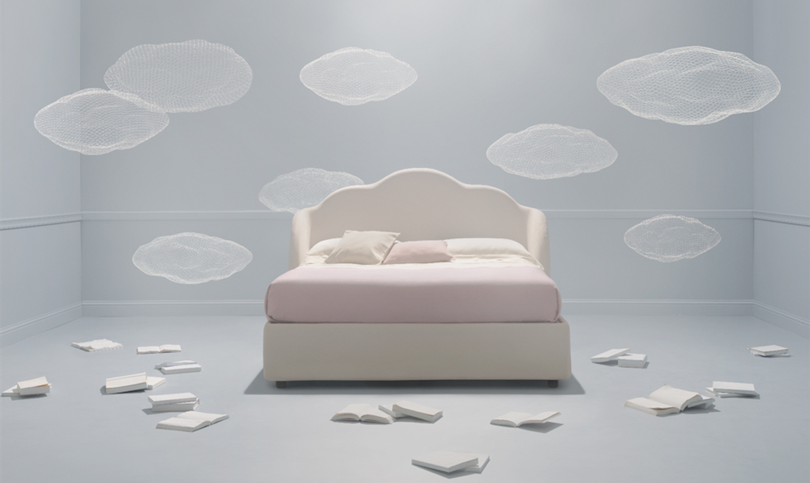 Abito: un lenzuolo prende la forma di un gigantesco cuscino, che diventa testiera del letto.