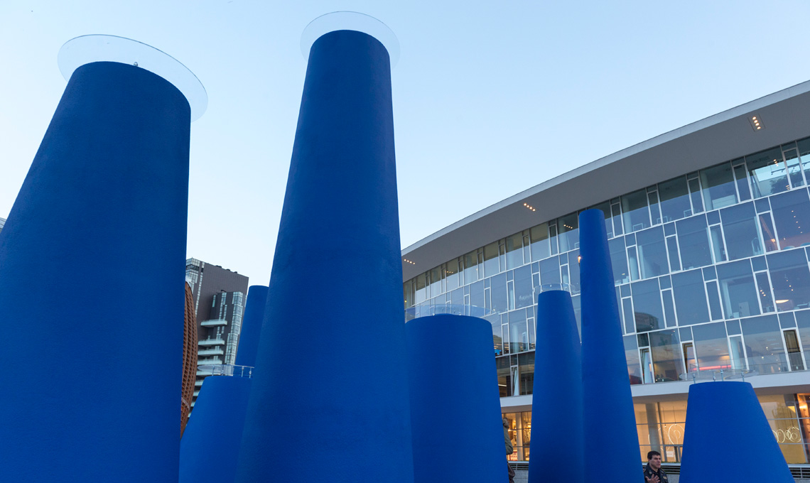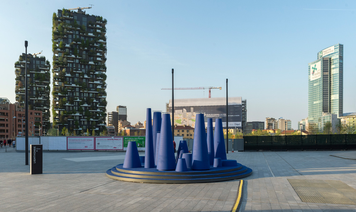 L’installazione è pensata per essere anche un luogo di sosta in questi, per ricaricare le proprie energie consumate dai flussi metropolitani frenetici: tra i coni blu cobalto è possibile fermarsi, sedersi, staccarsi dal contesto.