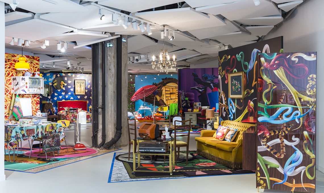 La mostra, dal titolo 'TP-rama', espone la serie di oggetti realizzati da ToiletPaper con il convolgimento dei brand italiani Gufram e Seletti, accessori per la tavola in latta, piatti in porcellana, tappeti, ombrelli e specchi dal look ironico e irriverente.