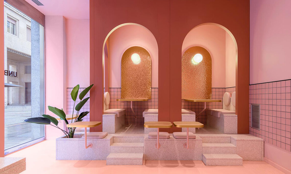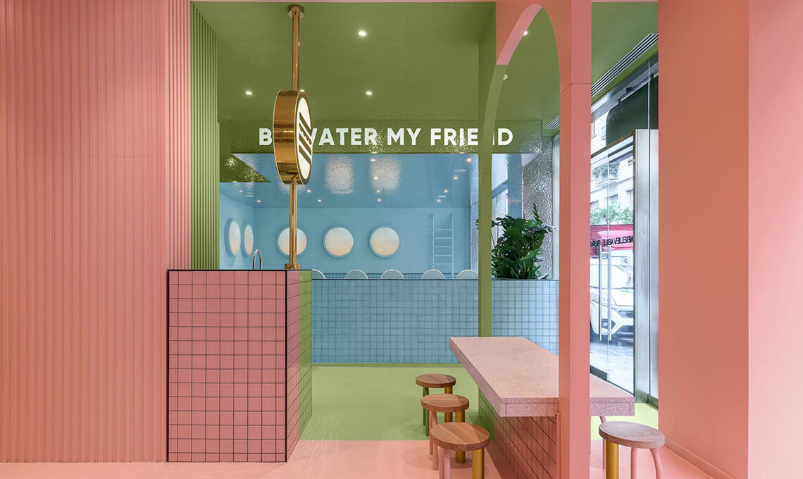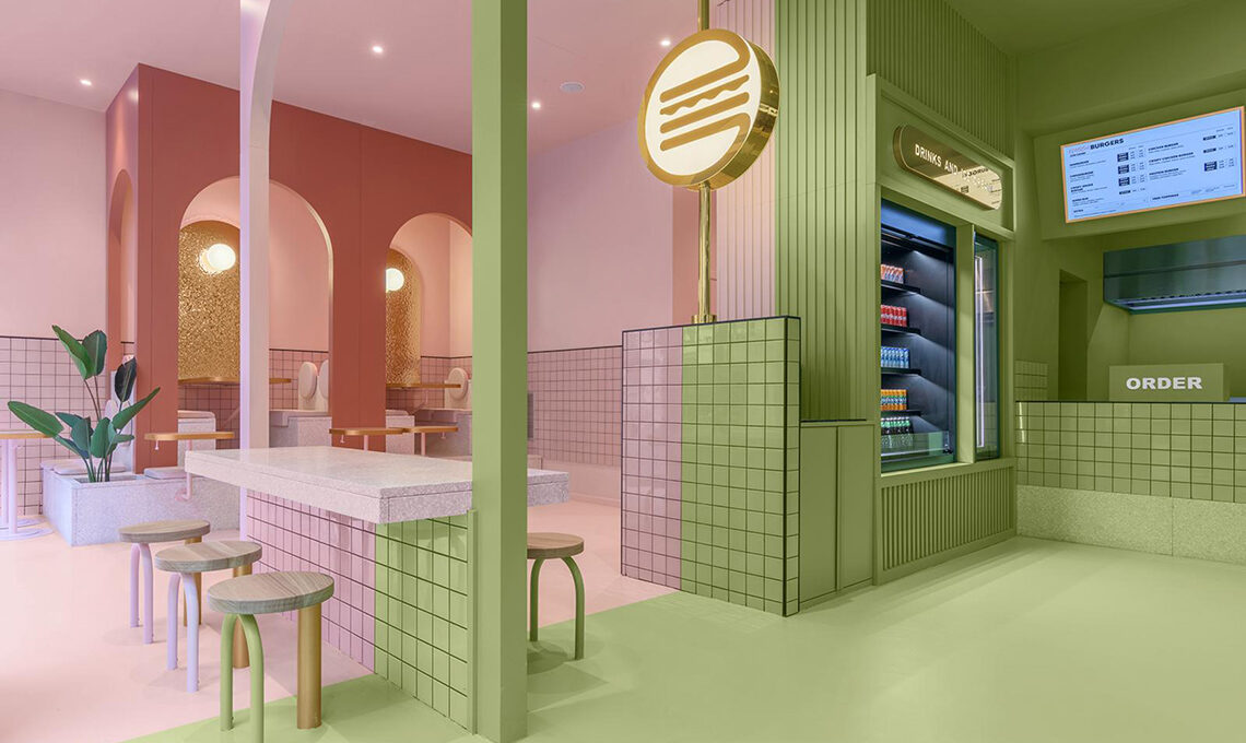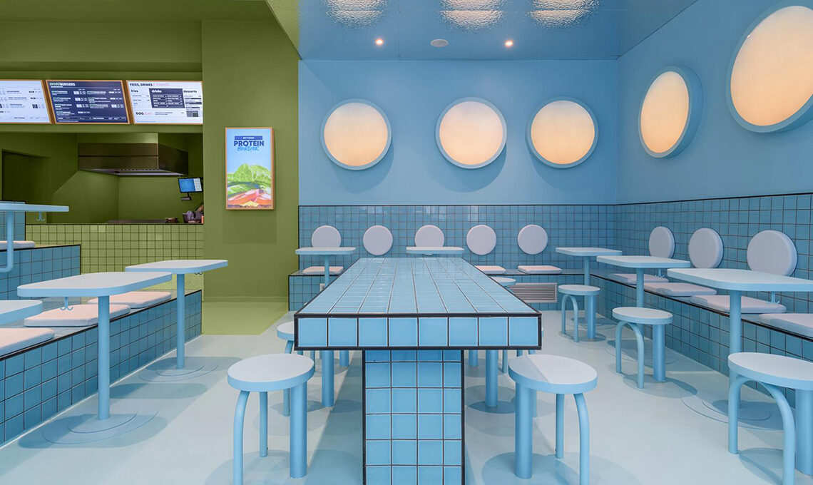 Nello spazio rosa si vede come, accanto al tavolo condiviso, sia allestita una tribuna che continua con il concetto di arco per dare la possibilità ai commensali di sedersi a diversi livelli. La zona blu invece, aggiunge un tocco di allegria e regala ai visitatori la possibilità di gustare i deliziosi Bun-burger in uno spazio che simula un'enorme piscina e che li fa sentire come se galleggiassero nell'acqua.