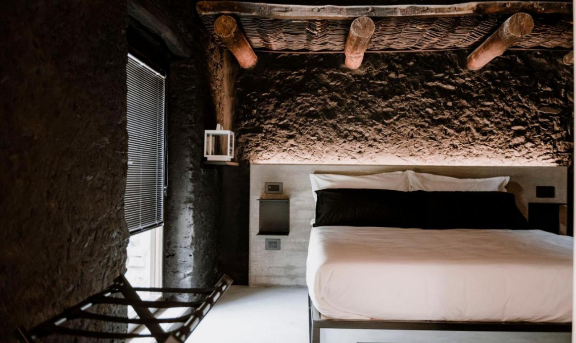 Un progetto, due anime: la parte storica dell’edificio ospita l’intimità della camera da letto, dove le pareti nere rivelano le origini della casa, in quanto l'essiccamento delle castagne anneriva le pareti in pietra.