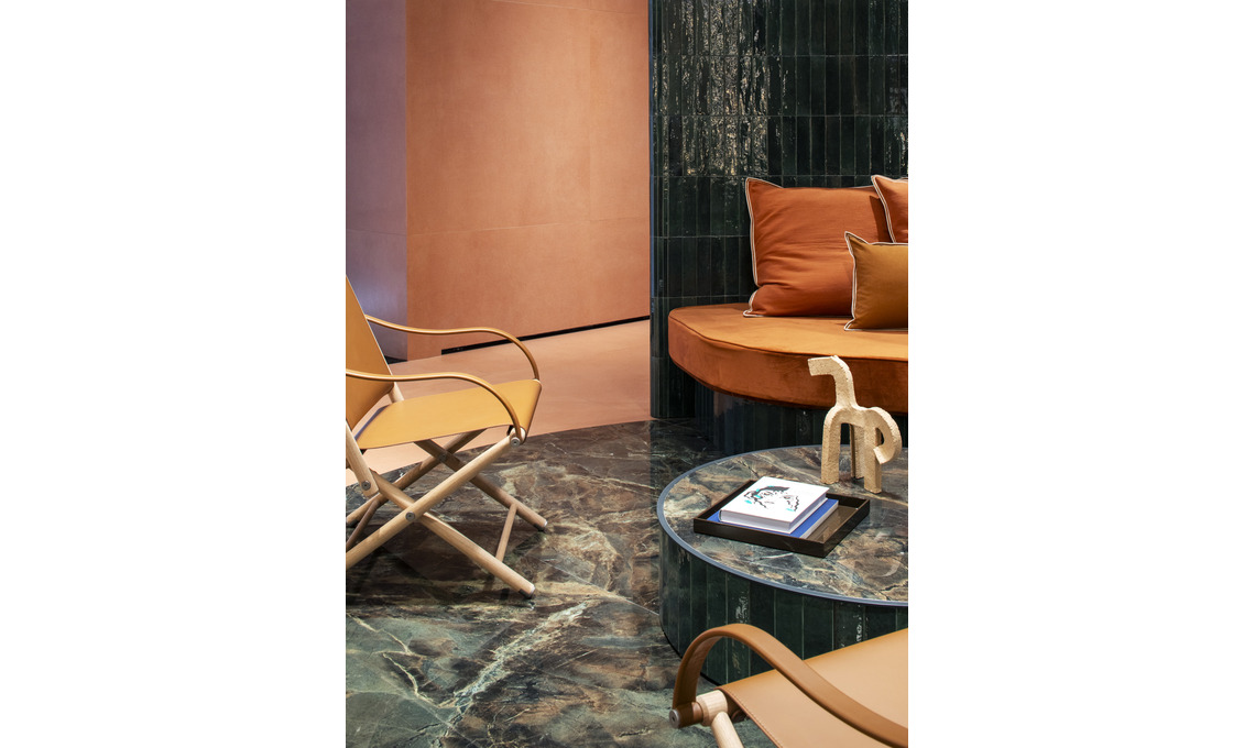 Il cuore dell’allestimento, Marazzi Privé, si ispira all’eleganza di una lobby d’hotel e propone tre ambientazioni in cui le maxi lastre in gres diventano protagoniste di scenografie dal forte impatto visivo.