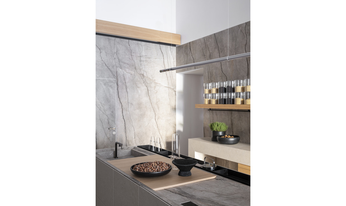 Le maxi lastre, presentate come tappeti decorativi, e le finiture esposte su mensole museali trasformano lo spazio in una vera e propria wunderkammer del design, dove ogni elemento dialoga con l’architettura circostante.