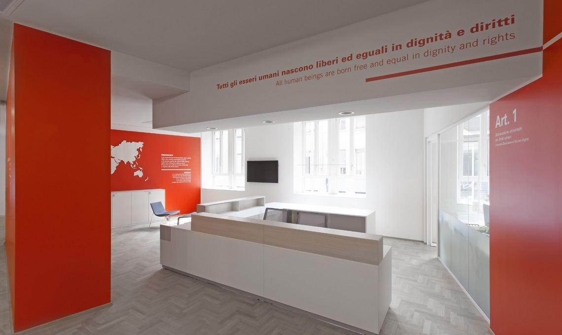 Ecco l'ingresso, nei classici bianco e rosso del logo di Emergency. Ai due piani alti ci sono gli uffici dell'associazione (foto Marcello Bonfanti per TAMassociati)