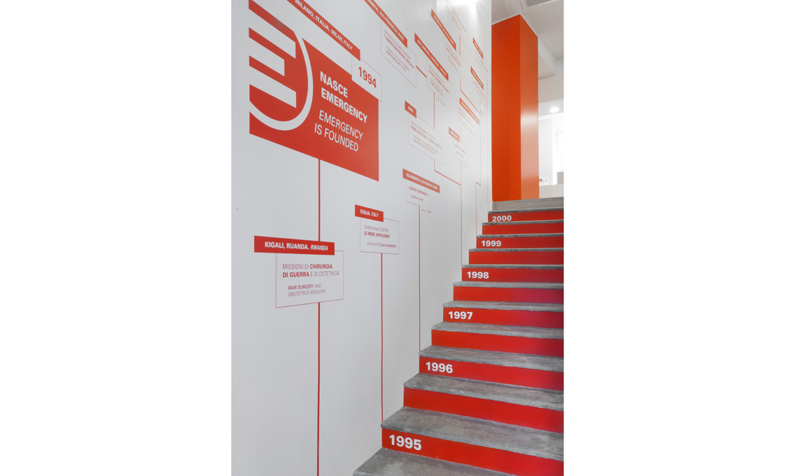 Lungo le scale sono evidenziate le tappe importanti del cammino di Emergency, da quando è stata fondata nel 1994 (foto Marcello Bonfanti per TAMassociati)
