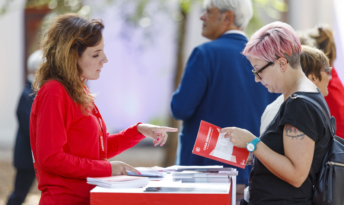 Un'operatrice di Emergency spiega, a una visitatrice, cos'è Casa Emergency e in generale le mission dell'associazione voluta da Gino Strada