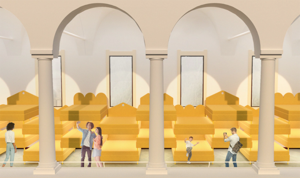 I letti Villa, Casale e Loggia di PerDormire, ispirati a tre archetipi dell’architettura italiana che da secoli accompagnano la nostra evoluzione urbanistica e sociale, diventano specchio e simbolo di una nuova idea di comunitò. L'installazione è all'interno del Loggiato Ovest dell'Università degli Studi di Milano.