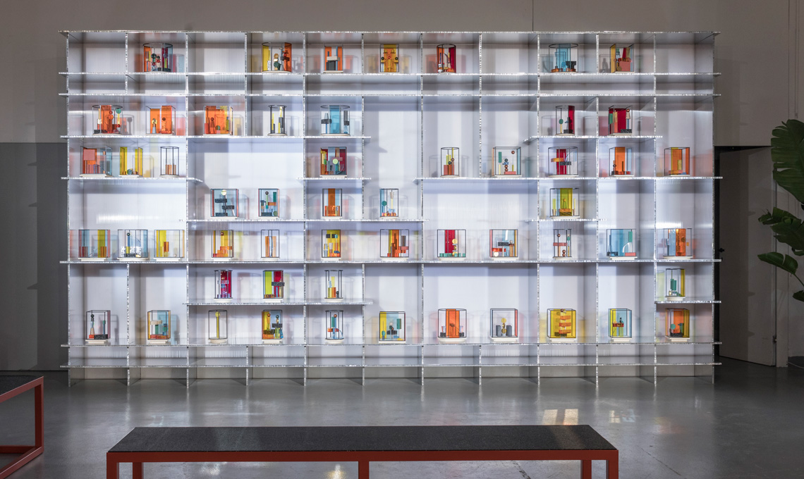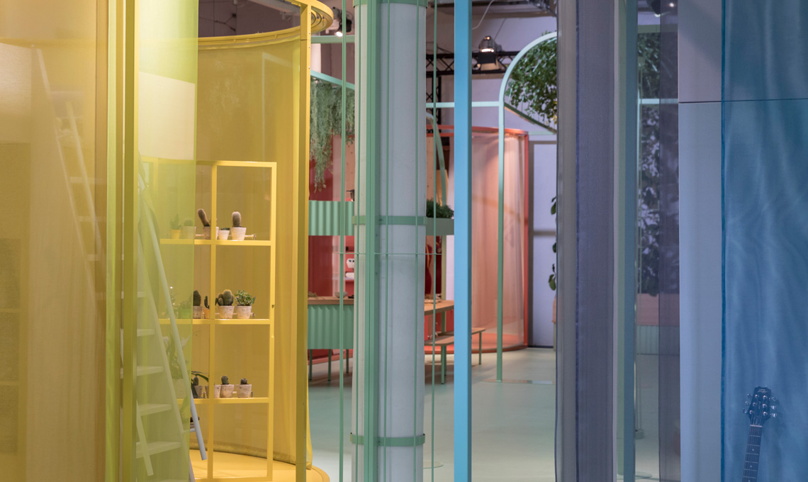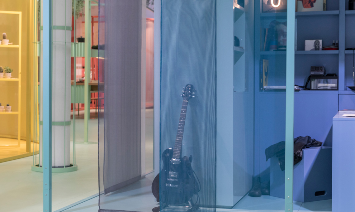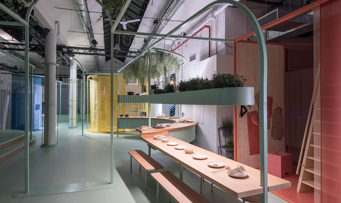 Aree diverse coesistono in un’unica situazione, con la finalità di ottimizzare la scarsità di spazio. Il risultato è formato da ambienti che si incrociano in un puzzle di luce e colori. ‘Communal’ è il mantra del cammino espositivo: Communal Amphitheatre, Communal Kitchen, Communal Garden e Communal Gym. Impossibile non incontrarsi.