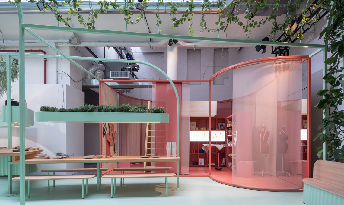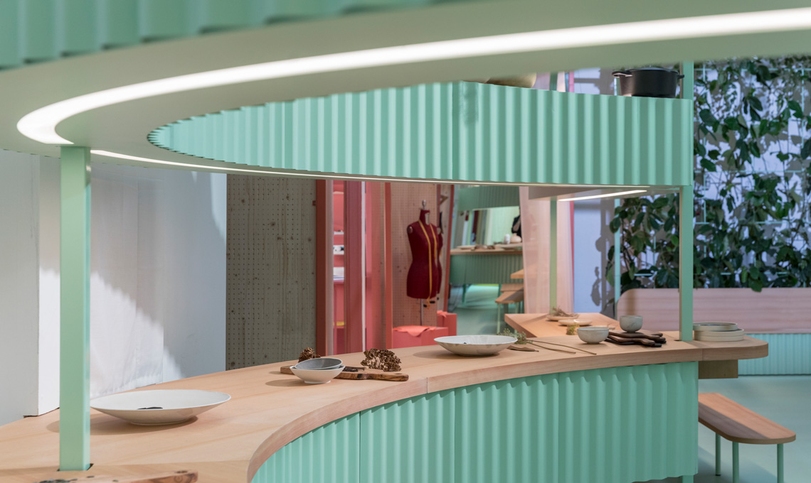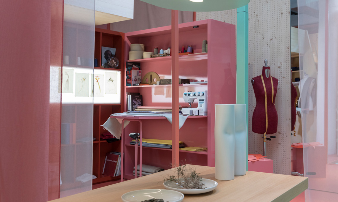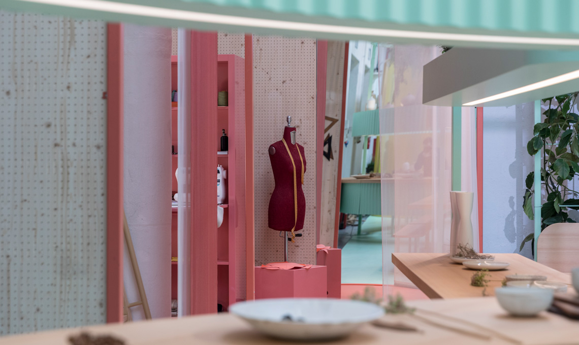 Aree diverse coesistono in un’unica situazione, con la finalità di ottimizzare la scarsità di spazio. Il risultato è formato da ambienti che si incrociano in un puzzle di luce e colori. ‘Communal’ è il mantra del cammino espositivo: Communal Amphitheatre, Communal Kitchen, Communal Garden e Communal Gym. Impossibile non incontrarsi.
