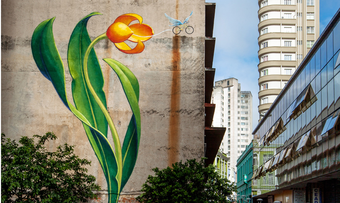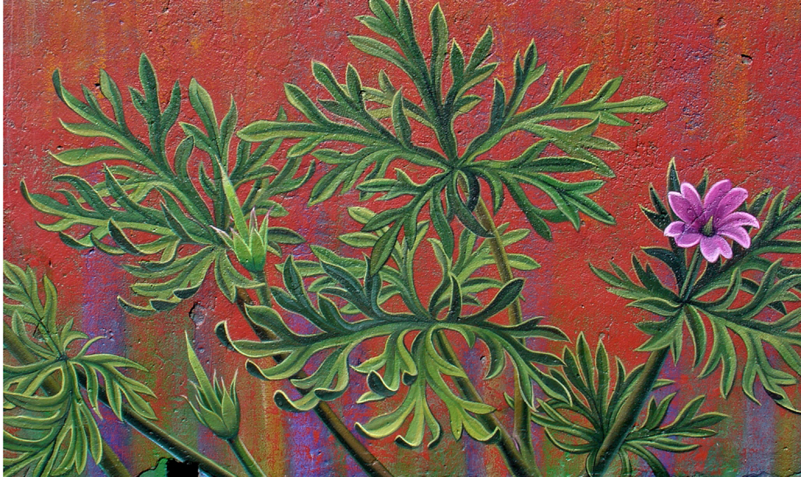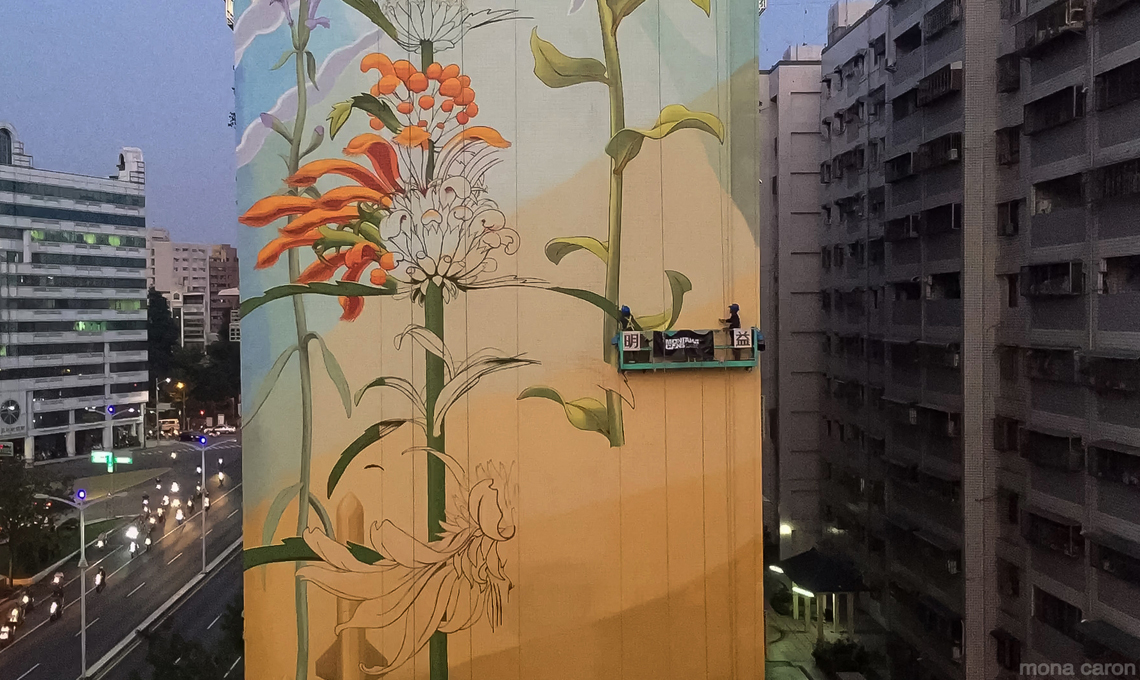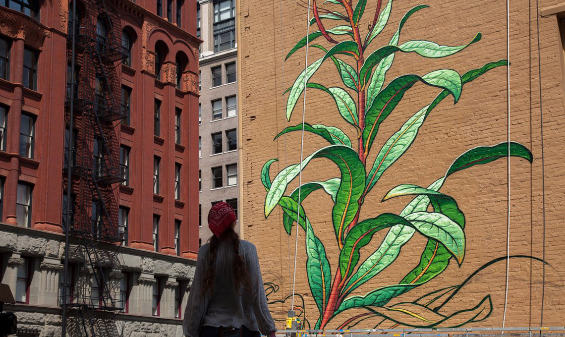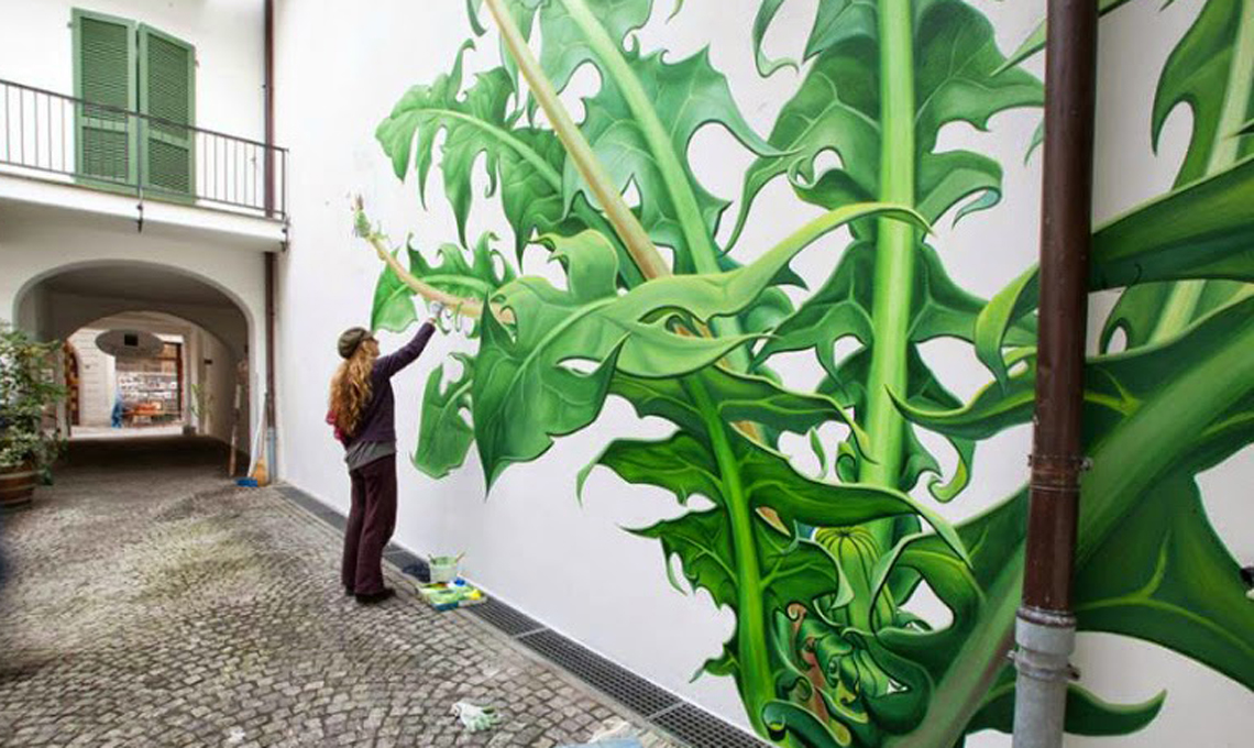 Mona Caron, è un’artista americana di murales vegetali di una bellezza commovente. Arrampicata su ponteggi mobili a ridosso dei muri, è in grado di dipingere delicati volteggi di foglie e petali di fiori in formato… veramente XXXL.
