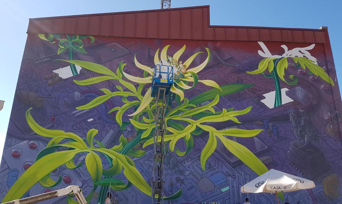 Puoi vedere i suoi paesaggi soprattutto a San Francisco, dove ormai vive e dipinge da anni. Ma il suo progetto 'Weeds' consiste nel dipingere murales e fotografare i vari stadi di realizzazione delle opere, dall’inizio alla fine. Dopo un lavoro di montaggio con le immagini raccolte, ha prodotto dei video che danno la sensazione di veder crescere i fiori che sbocciano dal cemento.