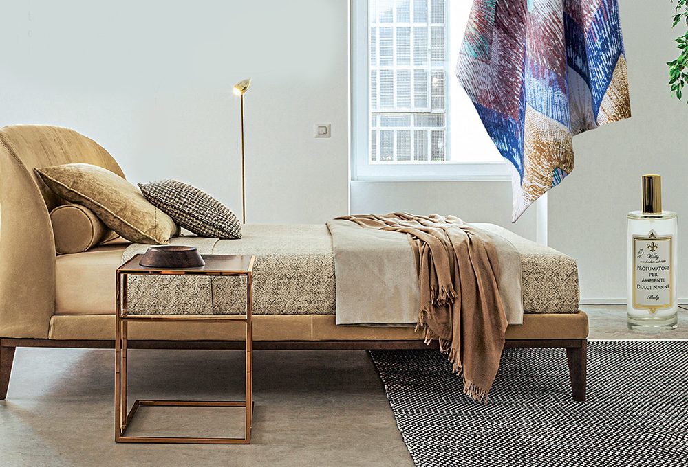 Al letto Circe che abbina le linee sottili di testiera e giroletto ai profili stondati e al capitonné Anni ’50, qui rivestito in tessuto Hive 100% cotone [Novamobili] abbiamo abbinato: