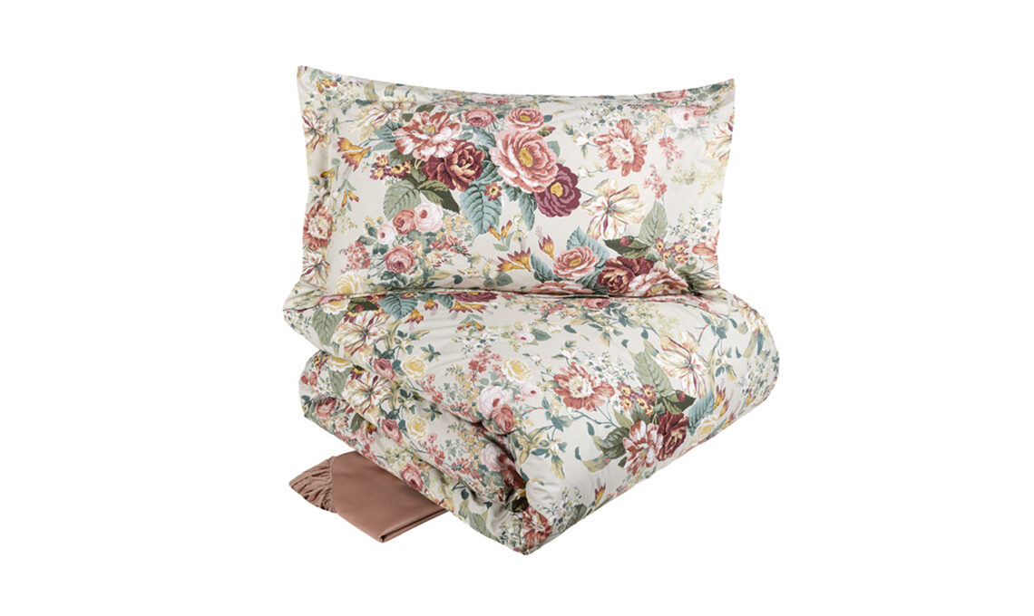 • Set copripiumino in percalle di puro cotone Aubusson con fantasia floreale su sacco e federe [Fazzini].