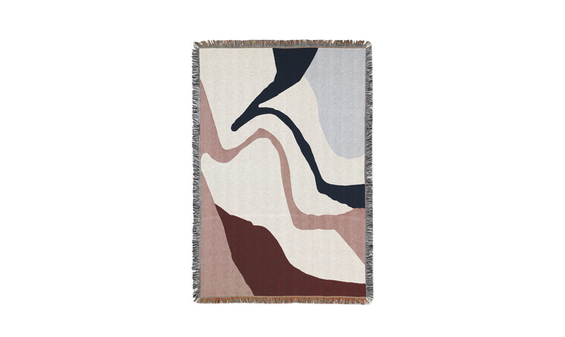 • Il plaid Vista in cotone rappresenta in modo astratto la terra vista dall’alto, bianco e rosa [Ferm Living].
