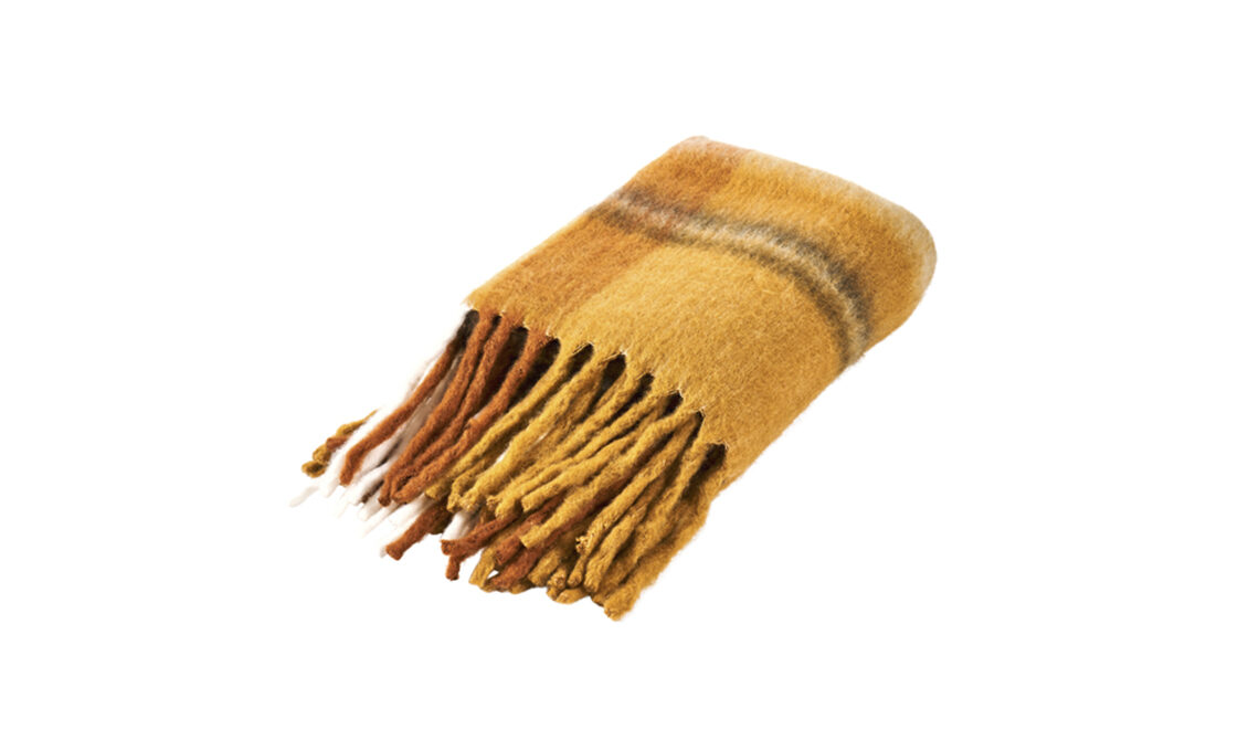 • Coperta in lana Jack, in varie nuances di giallo con un decoro tartan e frange [Casa].