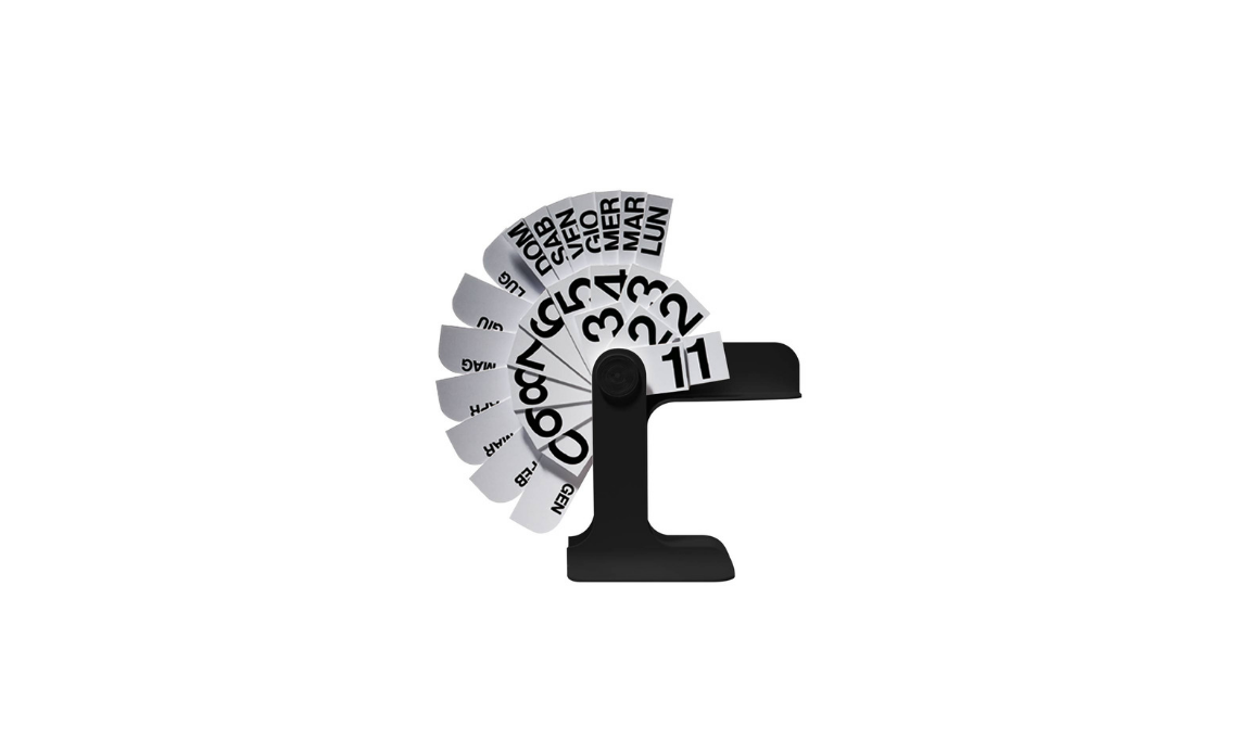 Timor è un calendario perpetuo da tavolo progettato da Enzo Mari nel 1967 e prodotto dal brand italiano Danese. La sua forma è ispirata alla segnaletica ferroviaria degli anni dell’infanzia di Mari. Un regalo perfetto se sei fan del design minimal.