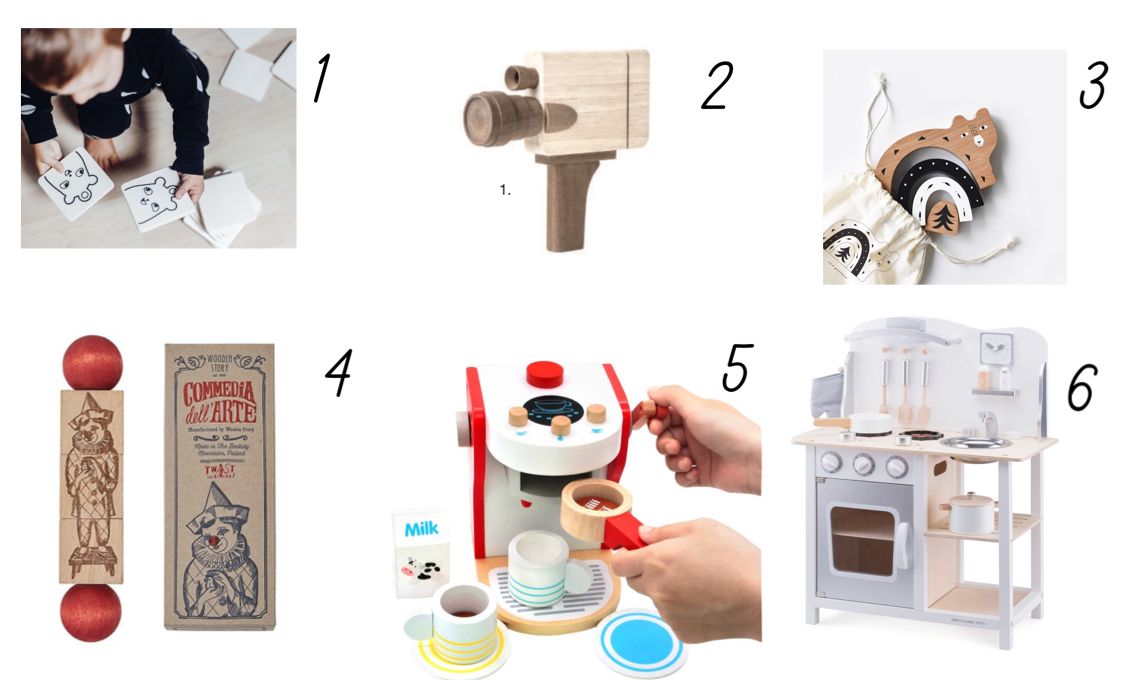1. Memory game [Ooh Noo €27,50]: 2. Movie camera [Argentina €38,60]; 3. Bamboo Nesting Bear [Wee Gallery €23]; 4. Twist the blocks Commedia dell’arte [Wooden story €27,76]; 5. Macchina per il caffè [su Amazon €24,99]; 6. Cucina in legno [New Classic Toys, su Amazon €84,99].