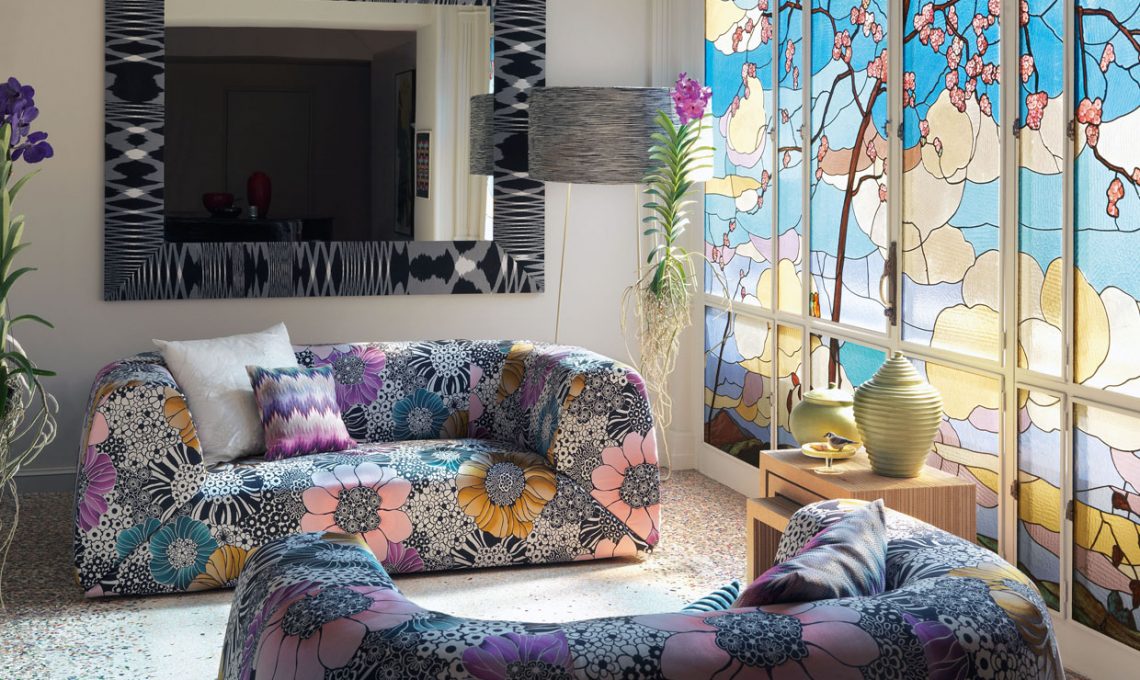 Maxi fiori in nuance delicate su fondi in bianco e nero per la collezione Anemones Dream firmata Missoni, stampa su lino-cotone Sorrento, ricoprono divani, poltrone, paraventi [Missoni Home].