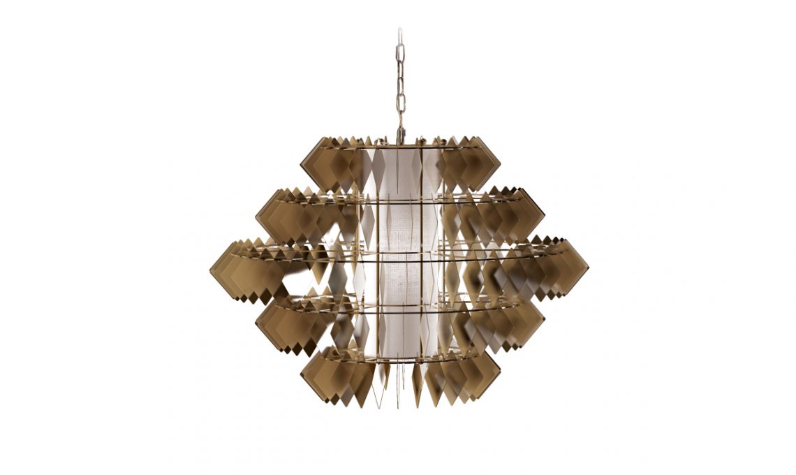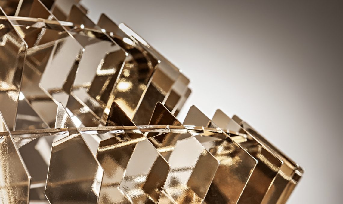 La nuova collezione Diamante New di Cantori comprende due lampadari, un’applique e una lampada da appoggio: foglie di acciaio con finitura dorata e riflettente creano giochi di luci all’interno degli ambienti.