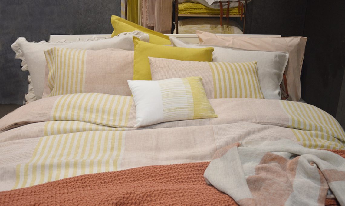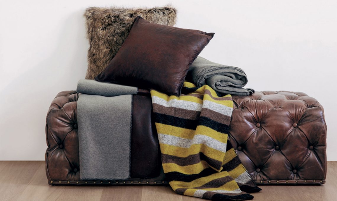 Toni caldi e autunnali per la nova linea autunno-inverno di Fazzini. Must la coperta a righe Maia in lana cotta. Cuscino Lupo e Camoscio, plaid Camoscio, Maia e Waffle.