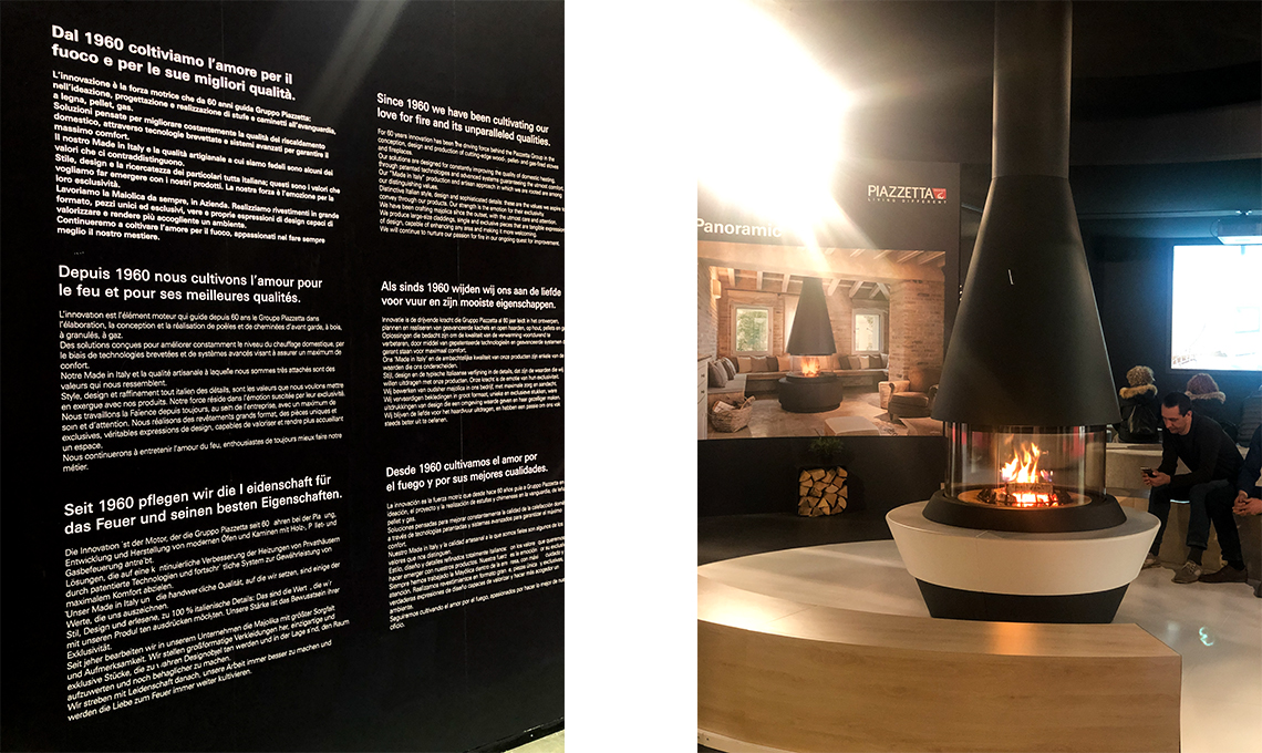 Piazzetta compie 60 anni e insolitamente partecipa alla fiera, presentando un unico suggestivo prodotto centrale allo stand, facente parte della collezione Panoramic. Linee nordiche, imponente e molto coinvolgente dal punto di vista delle relazioni che si creano tutto intorno. Alle pareti un excursus storico del brand, attraverso momenti importanti della storia Italiana in concomitanza con il lancio di prodotti del brand. In questi giorni è anche attiva la loro Fire Week 2020 in sede, per festeggiare l’anniversario e presentare tutti i loro prodotti a catalogo e le novità.