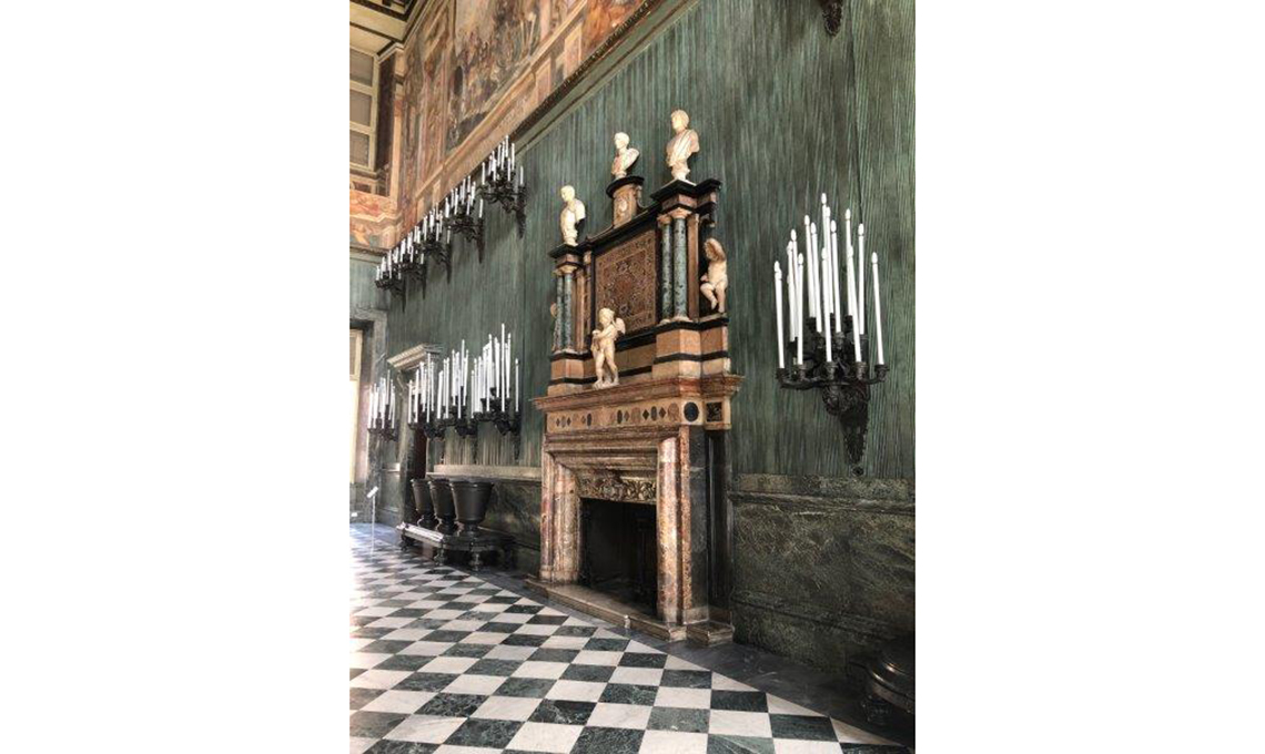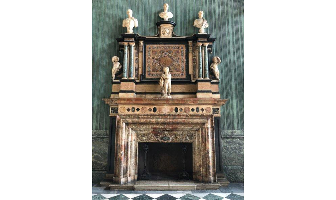 Il Caminetto Monumentale, nel Salone della Guardia Svizzera, risale alla prima fase decorativa del Palazzo, ed è databile al 1661 con marmi policromi e putti laterali. Sulla sommità spiccano tre busti di Imperatori Romani e all’interno del camino è presente una lastra con stemma sabaudo e alari ottocenteschi in ferro battuto.